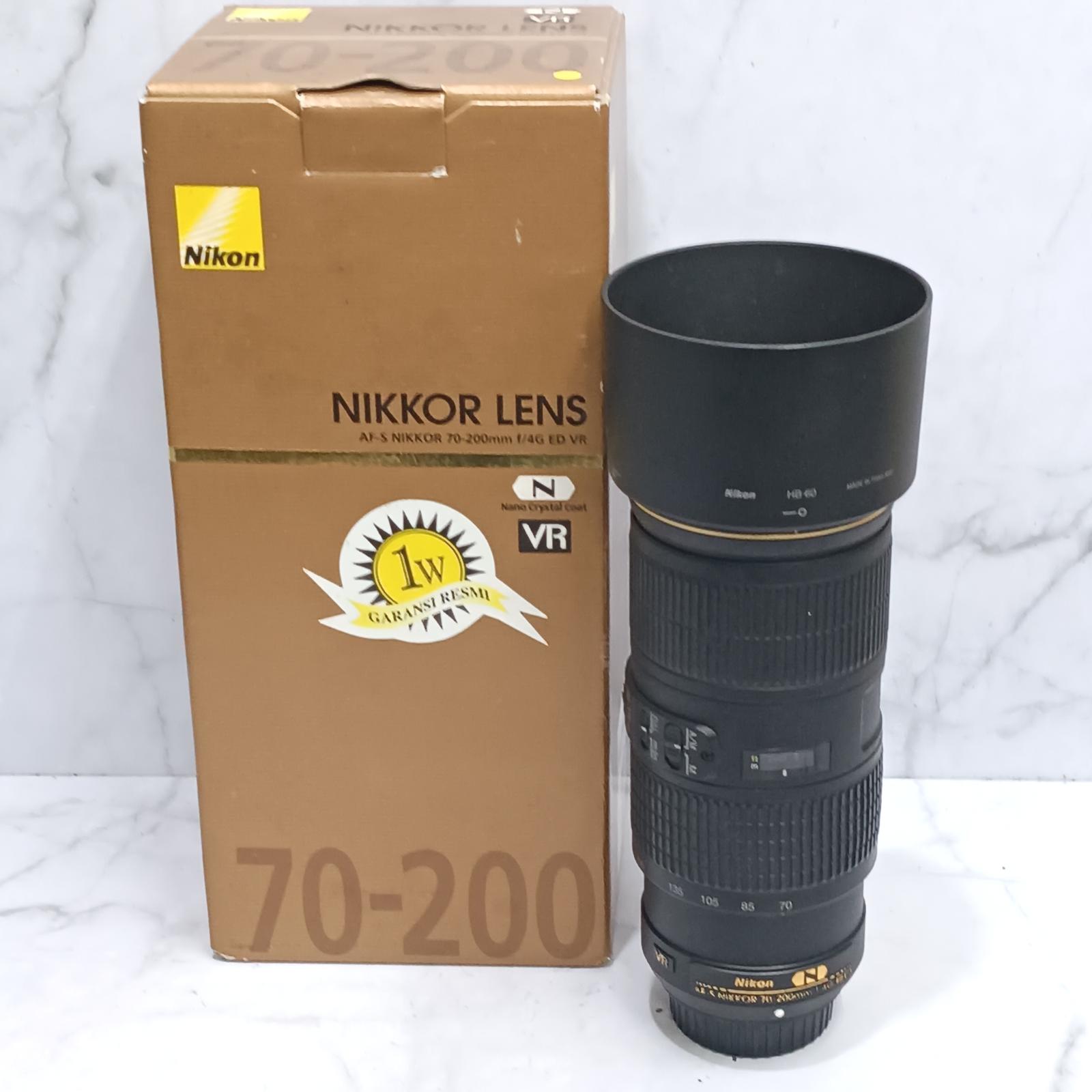 Keunggulan: Rentang telephoto fleksibel 70–200mm aperture konstan f/4 untuk eksposur stabil teknologi Vibration Reduction (VR) untuk hasil foto lebih tajam kualitas optik tinggi dengan elemen ED autofocus cepat dan senyap dengan AF-S bobot lebih ringan dibanding versi f/2.8 build quality kokoh dan profesional cocok untuk kamera Nikon full frame dan DX.